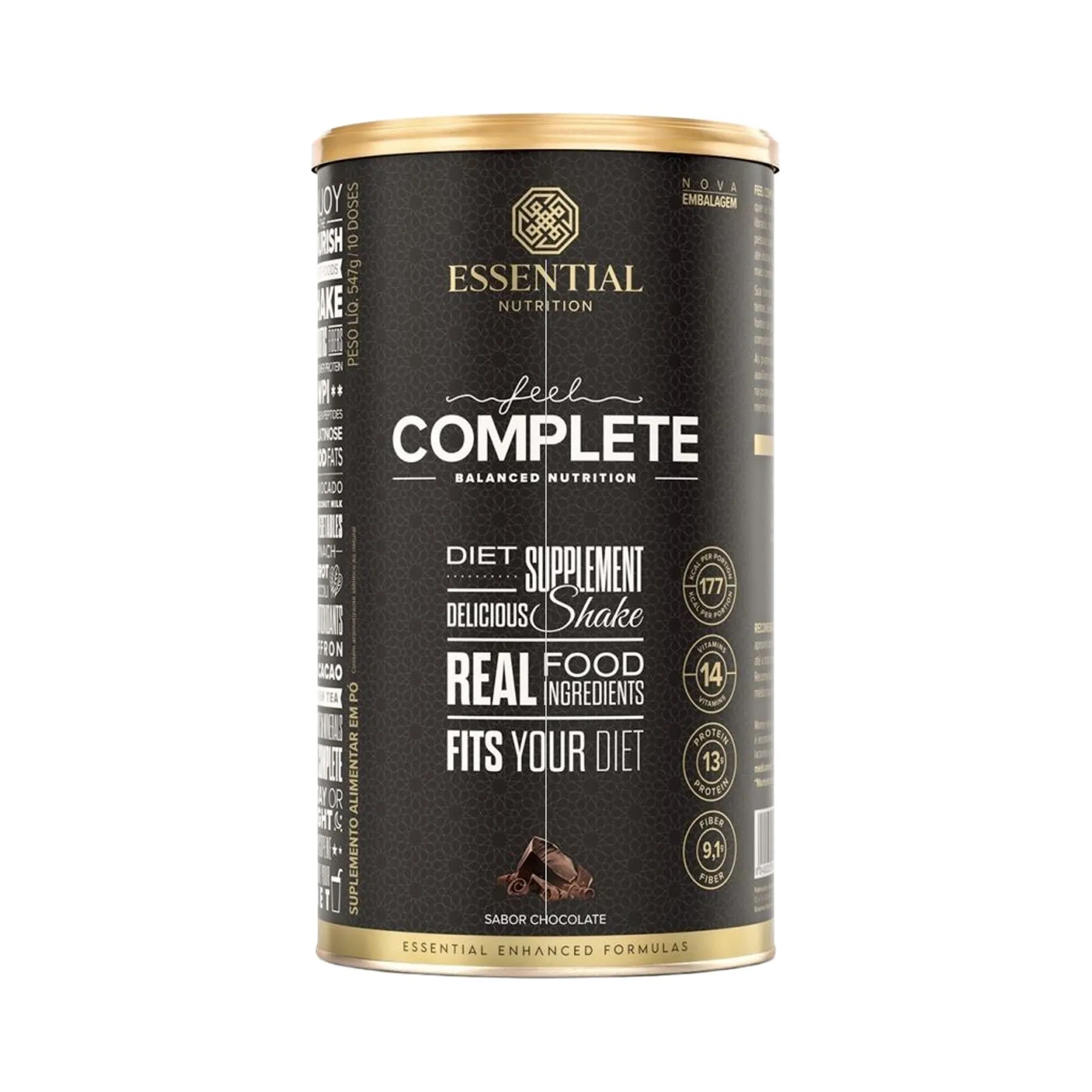 Feel Complete da ESSENTIAL é um shake nutricionalmente completo, prático e saboroso. Um grande aliado para adultos em diversos tipos de dieta ou idosos que procuram opções balanceadas. Além disso, ele entrega macro e micronutrientes em sua melhor forma, tudo isso com um delicioso sabor de chocolate e 177 calorias. Feito com alimentos de verdade Feel Complete fornece um blend de vegetais naturalmente ricos em fitonutrientes que vêm da couve, cenoura, do espinafre, brócolis, açafrão, chá-verde, feijão branco e cacau puro, todos ingredientes com origem natural que têm papel fundamental para o nosso organismo. Feel Complete é mais um produto Essential Enhanced Formulas A linha Enhanced Formulas reúne produtos que compreendem o funcionamento do nosso corpo, a sinergia entre as reações químicas e as múltiplas propriedades que podem ser conquistadas através da combinação dos nutrientes corretos.
